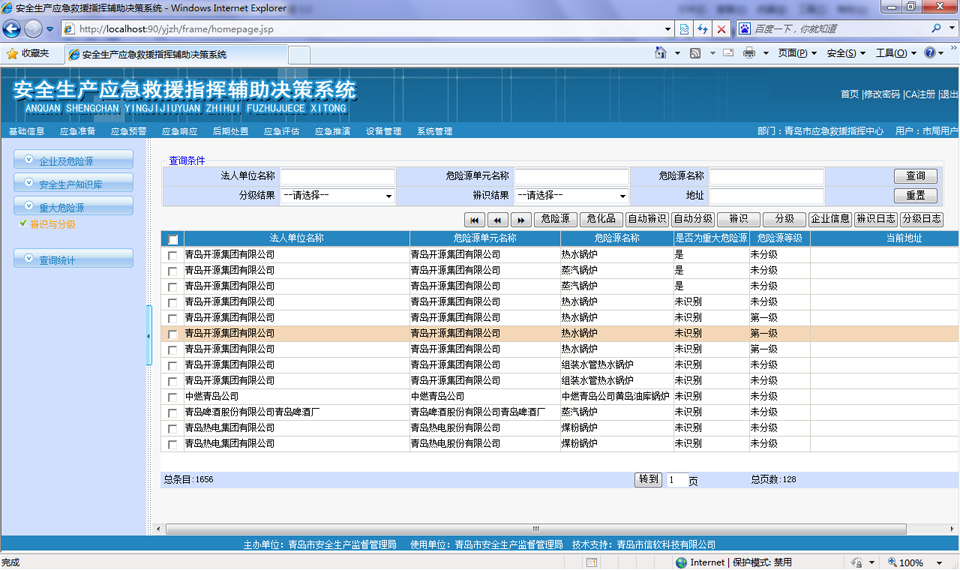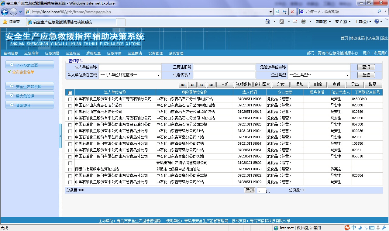 ?  對存在危險源的企業進行管理和查詢,可以按地區、經濟類型、所屬行業等支持多種查詢條件進行綜合查詢,查詢結果提供企業和所屬危險源的具體信息、以樹形結構展示單位基本情況、及其附屬的安全評價、行政許可等分類信息,方便政府主管部門查看危險源企業的各種動態情況。可以在線查詢調閱危險源視頻監控信息、三維模型信息、GIS詳細信息,企業及危險源信息可以導出到excel或者word中。