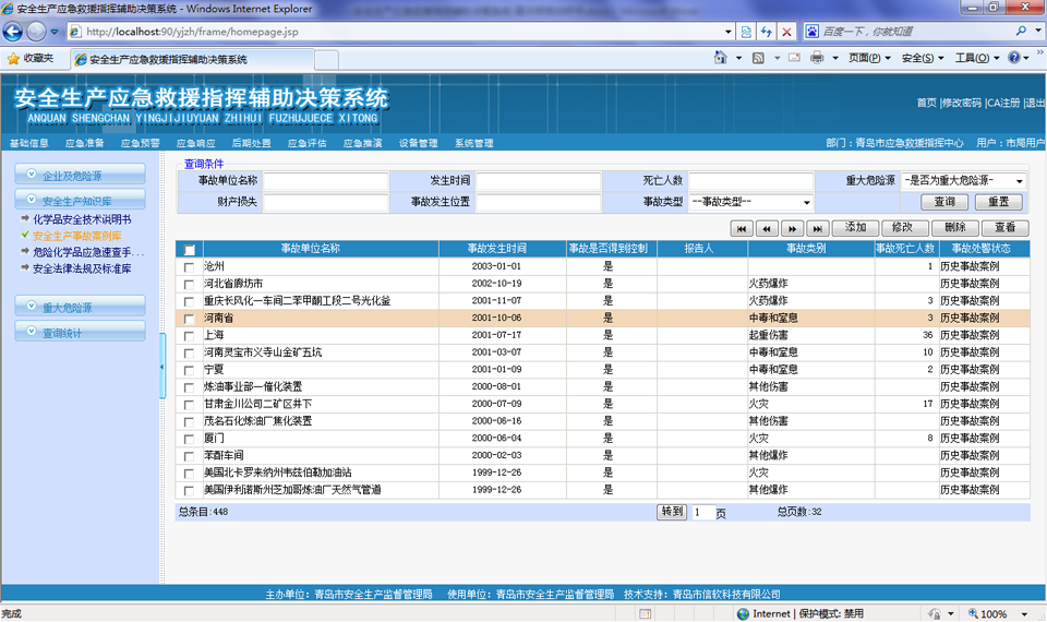 系統建成后可以滿足安監部門日常監管和戰時指揮調度要求;能加強日常安全監管工作,管理企業及重大危險源信息、安全生產知識庫、應急資源(專家、設備物資等)、數字化預案等,掌握重大危險源和應急資源的空間分布情況。
