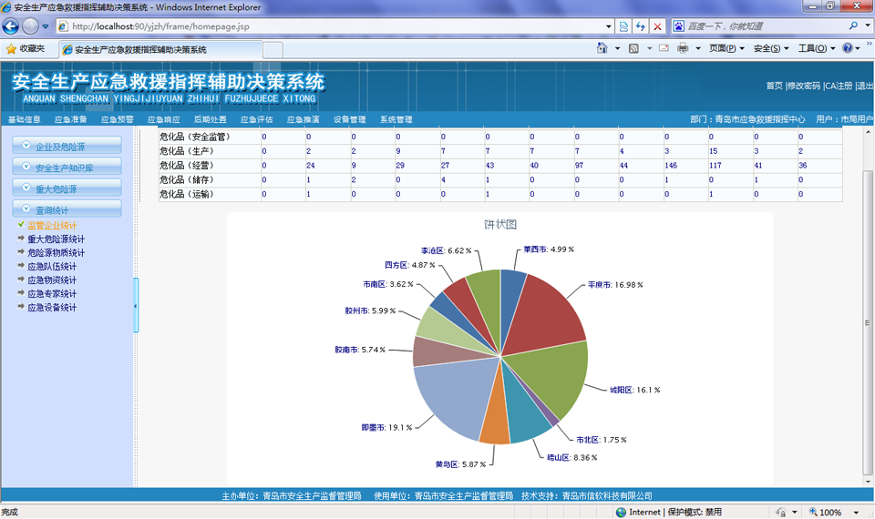 以醒目的報表形式,對重大危險源分布、監管企業、危險物質、應急資源進行統計列表展示,并支持多層次頁面鏈接方式查詢與瀏覽重大危險源、企業綜合信息,支持鉆取功能。并在此基礎上進行數據挖掘和深入分析,查詢結果既可以顯示為原始的文本數據也可以分類統計總和,提供柱狀、餅狀等各種形式的圖形。