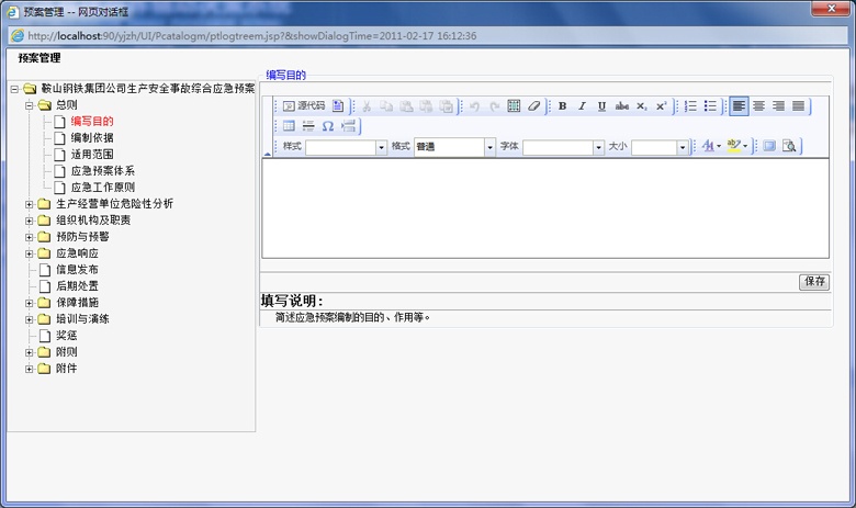 應急預案有綜合應急預案、專項應急預案、現場處置方案構成,由于綜合預案、專項預案、現場處置預案的目錄和編制內容并不相同,在編制預案時,編制人員可隨時讀取預案模板或案例進行參考,系統并可提示幫助信息,輔助完成預案的編制、修訂。