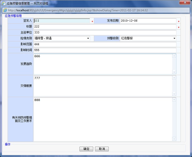 根據青島市發布的預警信息并結合安監局業務,提前發布一些預警信息或通過電話、傳真、手機、短信等方式,獲取預警信息。預警信息需要根據事態的進一步發展核實后,根據系統權限,向應急事件可能涉及的區域發布,當預警結束后解除預警。