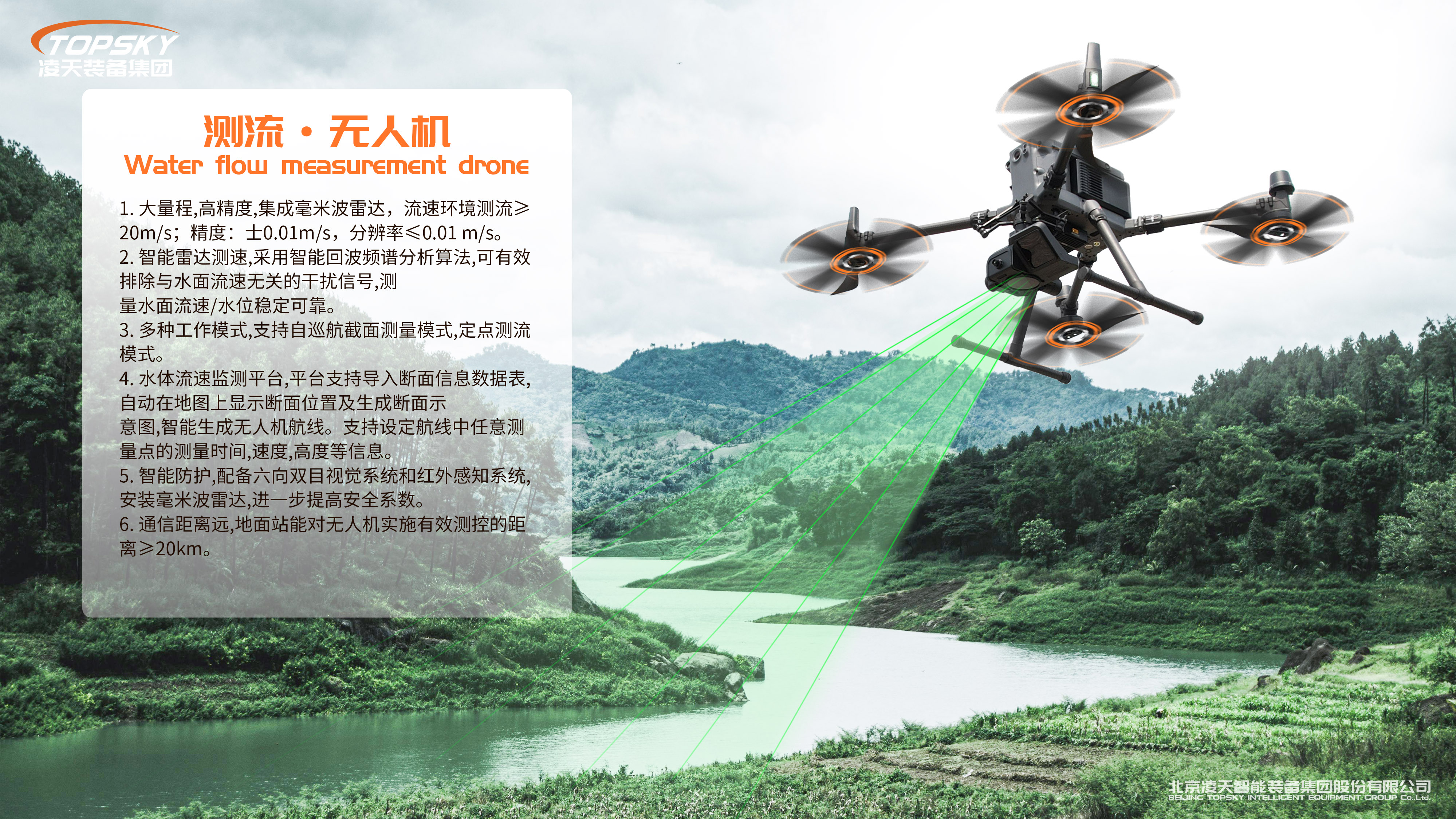 測流無人機具備水體流速、流量監(jiān)測等系統(tǒng);用于暴雨洪水流動速度,特別是堤防潰口水流速度的快速探測。具備無人機水體流速、流量的監(jiān)測系統(tǒng),流速環(huán)境測流≥20m/s。