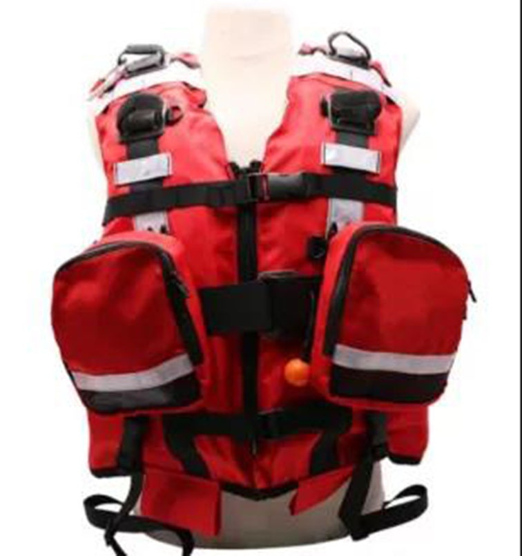 消防專用救生衣由背心式救生衣體、救生衣氣囊、氣脹式救生圈、輔件及屬具組成。背心式救生衣體由固有浮力材料及包布組成。救生衣輔件主要包括拉鏈、敷帶、反光帶、搭扣及掛環等,其中敷帶包括襠帶和收緊帶。