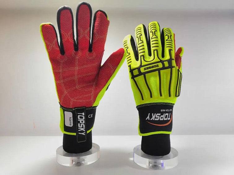 采用3D立體設計,符合人體手型自然彎曲,手掌指尖一片式翻轉手指背,主體顏色為橘紅色和黃色,主要材質為牛皮和芳綸雙面針織布,總體性能符合《GA633-2006消防員搶險救援服裝》的標準。