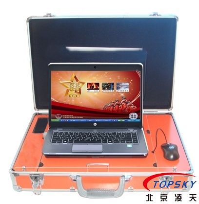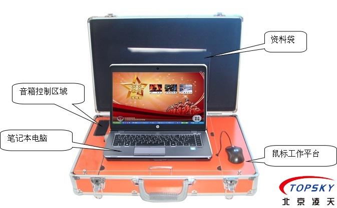 開(kāi)式手提箱結(jié)構(gòu),箱體上蓋部分為資料存放處,下箱體部分的上層為筆記本電腦操作平臺(tái),右側(cè)為鼠標(biāo)工作平臺(tái),左側(cè)為音箱控制區(qū)域,下箱體的下層部分為一起設(shè)備存放區(qū)域;