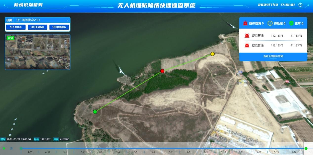 系統主要針對汛期堤防滲漏、管涌、塌陷場景進行快速排查隱患需求以無人機搭載雙光相機匹配原理,結合人工智能辨識算法形式進行巡查;系統設計化繁為簡,具備GIS高清底圖,能夠展示村莊、河道名稱及經緯度信息,數據支持一鍵處理,保障高效運行。