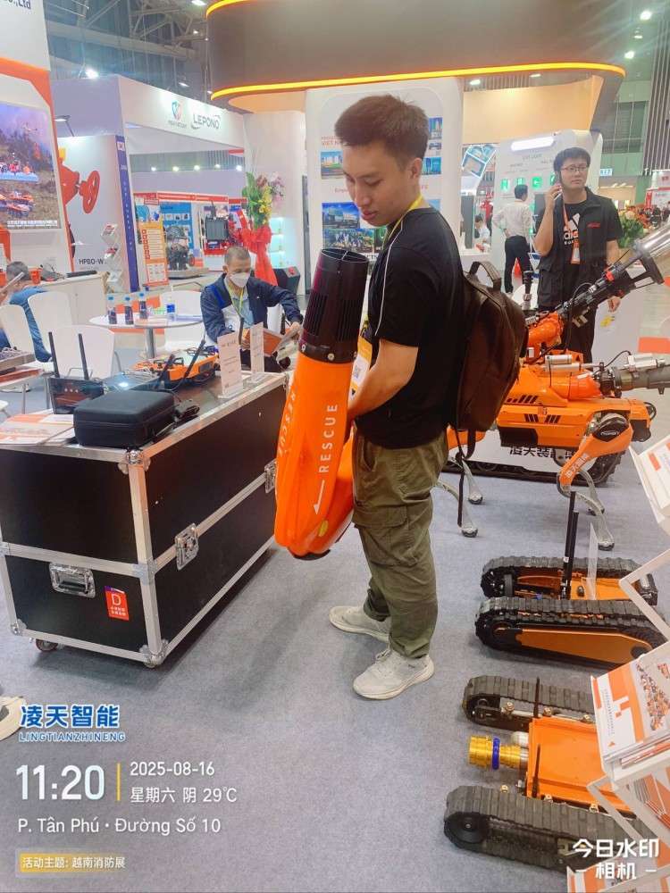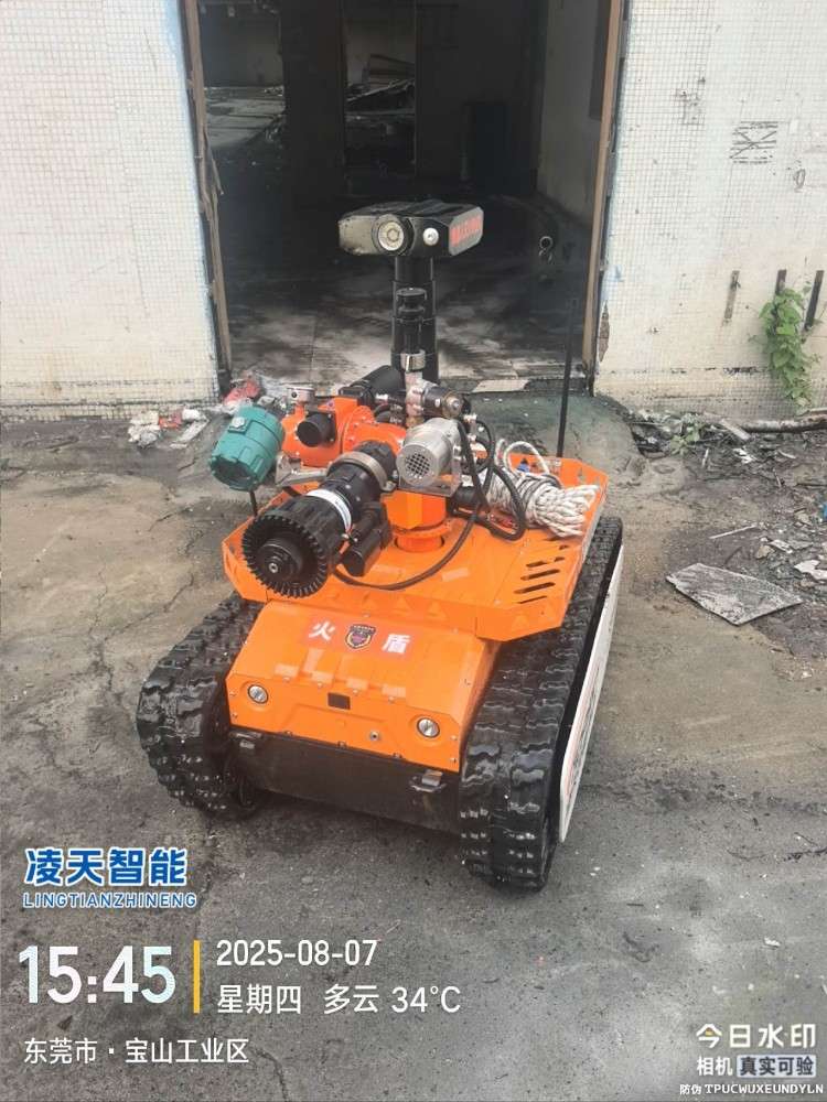 機器人采用無線遙控設計,遙控器與監(jiān)視器一體/分離,可實時的顯示電池、內(nèi)部的各種信息,機器人狀態(tài)、現(xiàn)場溫濕度、有毒有害氣體濃度報警信息等控制機器人前進、后退、轉(zhuǎn)向等運動。具備遠程偵察能力,機身搭建升降云臺、高清攝像頭、熱成像攝像頭、氣體傳感器三類環(huán)境感知設備和云臺控制設備,也可聯(lián)動聲光報警模塊提醒消防人員或群眾,有效避免危險。在通過遠程偵察手段有效獲取現(xiàn)場火源信息后,機器人配備的大功率電機可以幫助消防人員將消防水袋拖拽至危險火源區(qū)域進行滅火,并能搭載各類國內(nèi)、外的多種消防水泡,并能夠遠程控制發(fā)射水或泡沫。基于所配備的拾音模塊和揚聲器模塊,拾取現(xiàn)場環(huán)境聲音,即使消防官兵未靠近消防現(xiàn)場也能夠聽到搜救現(xiàn)場的群眾呼救聲,并通過揚聲器模塊與群眾進行現(xiàn)場對話。