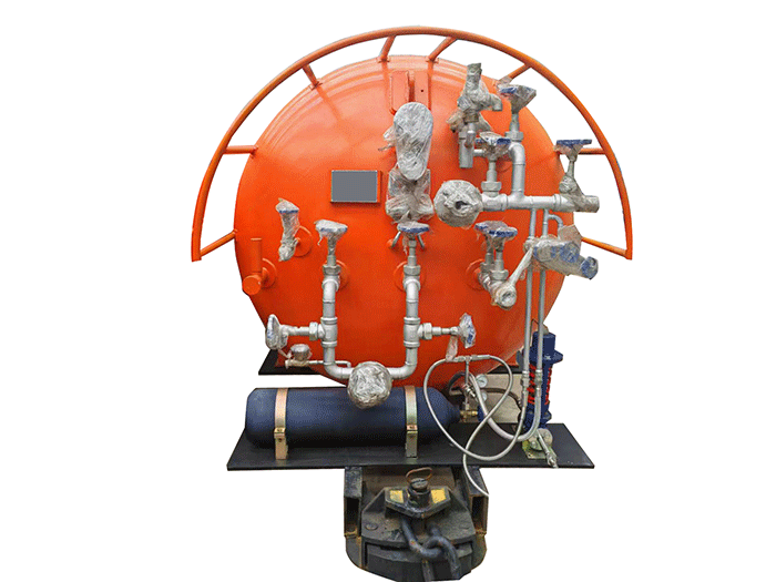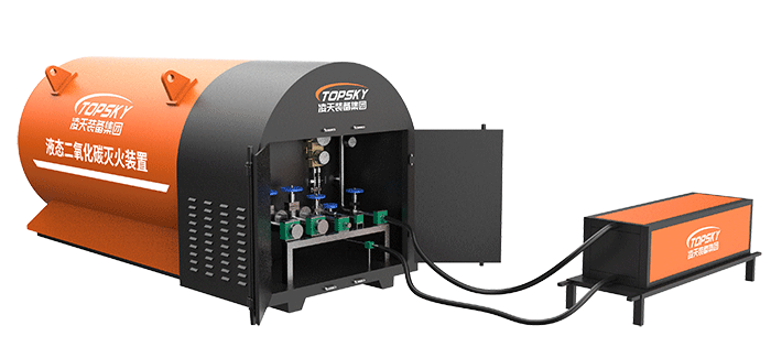 液態(tài)二氧化碳滅火裝置,采用平板車為運(yùn)載平臺(tái),搭載液態(tài)二氧化碳滅火模塊,采用液態(tài)二氧化碳為滅火劑,運(yùn)輸至井下火區(qū)近附,經(jīng)自增壓調(diào)控系統(tǒng)實(shí)現(xiàn)罐內(nèi)穩(wěn)壓,并通過(guò)遠(yuǎn)距離輸送管路將液體從罐內(nèi)向密閉火區(qū)噴射,利用其急速膨脹氣化和吸熱效率高的物理特性,可實(shí)現(xiàn)惰性降氧,吸熱降溫,吸附阻化等功能,從而可快速進(jìn)行井下煤層自燃火災(zāi)的預(yù)防與撲滅等。