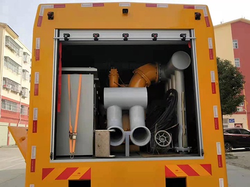 配備一臺一體式真空輔助自吸排污泵,流量1500m3/h,電機功率90kw,揚程14m,吸程8m,安裝在車輛尾部,方便拆卸水管及出水。該泵無需灌水,無需額外增加水環(huán)泵輔助抽真空,性能好,出水快。水泵啟動采用軟啟動
