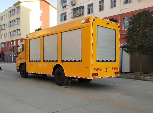 廂體外部鋼材為優(yōu)質(zhì)冷軋鋼板,內(nèi)襯優(yōu)質(zhì)冷軋鋼板折彎骨架,工藝先進,強度牢固。廂體為全密封結(jié)構(gòu),具備運輸、防雨、防腐、防火、防銹要求。車廂尾部安裝鋁合金卷簾門。發(fā)電機組進排風消聲處理,消聲器做降噪處理。車廂水泵兩側(cè)設(shè)開門,發(fā)電機進風口和排風口防雨百葉窗,工作門下,尾部設(shè)有隱藏式抽拉梯,與車廂底板框架連接。