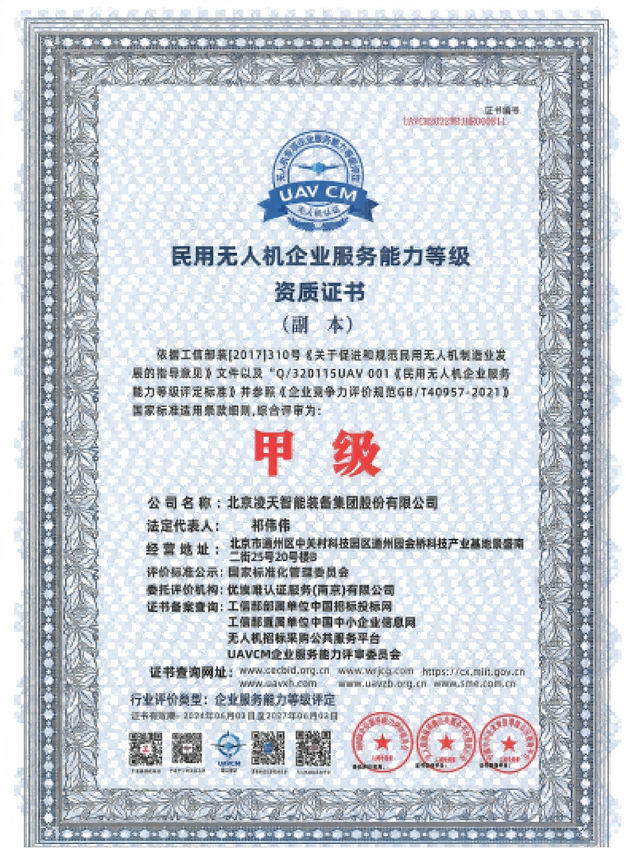資格類 | 民用無人機企業服務能力等級資質證書(甲級) | |